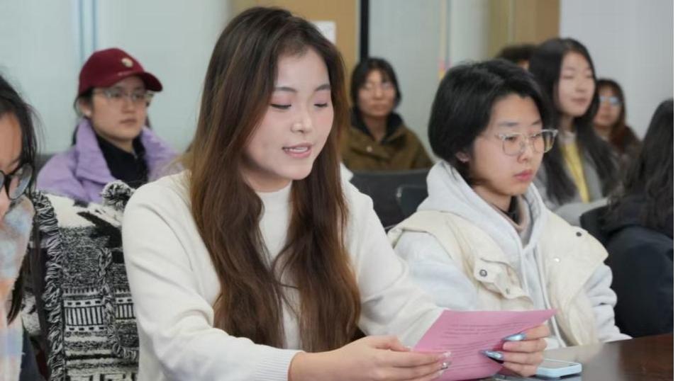学院资助工作辅导员梅傲寒向参会同学介绍了“卓越纺织”专项奖学金基本情况,2024级纺织工程专业的崔文鑫同学作为获奖学生代表进行了发言,鼓励同学们将个人成长融入行业发展,书写新时代纺织人的担当。